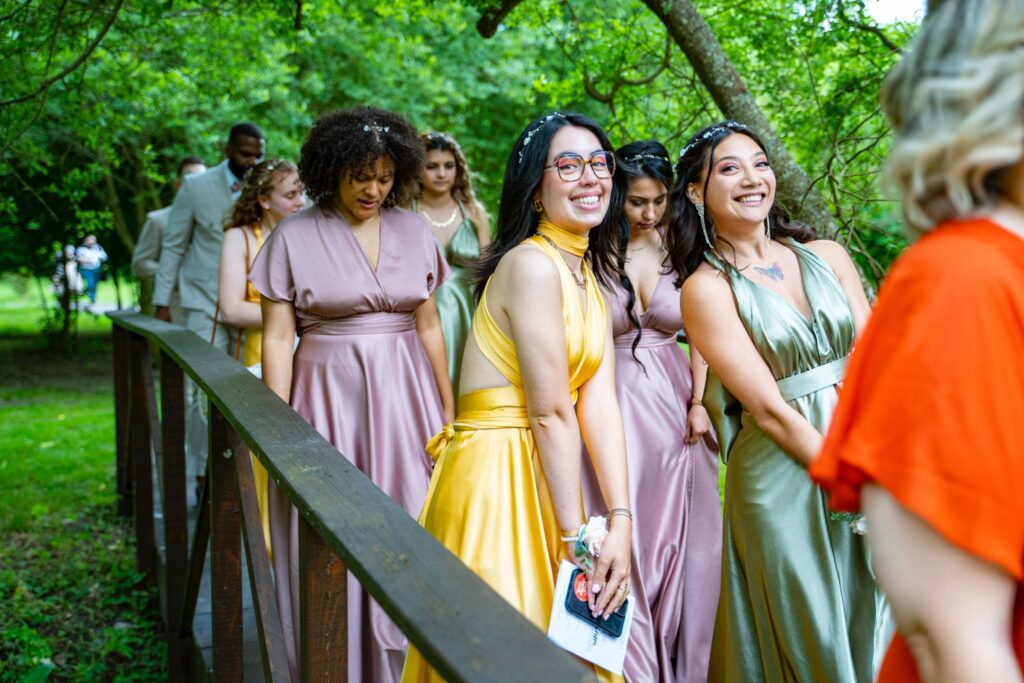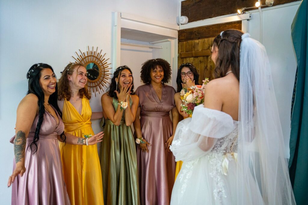 Pour cette création, chaque demoiselle d’honneur a pu exprimer sa personnalité tout en gardant une belle unité. J’ai imaginé une coupe grecque élégante en satin brillant, fluide et lumineuse, qui s’adapte à toutes les morphologies.